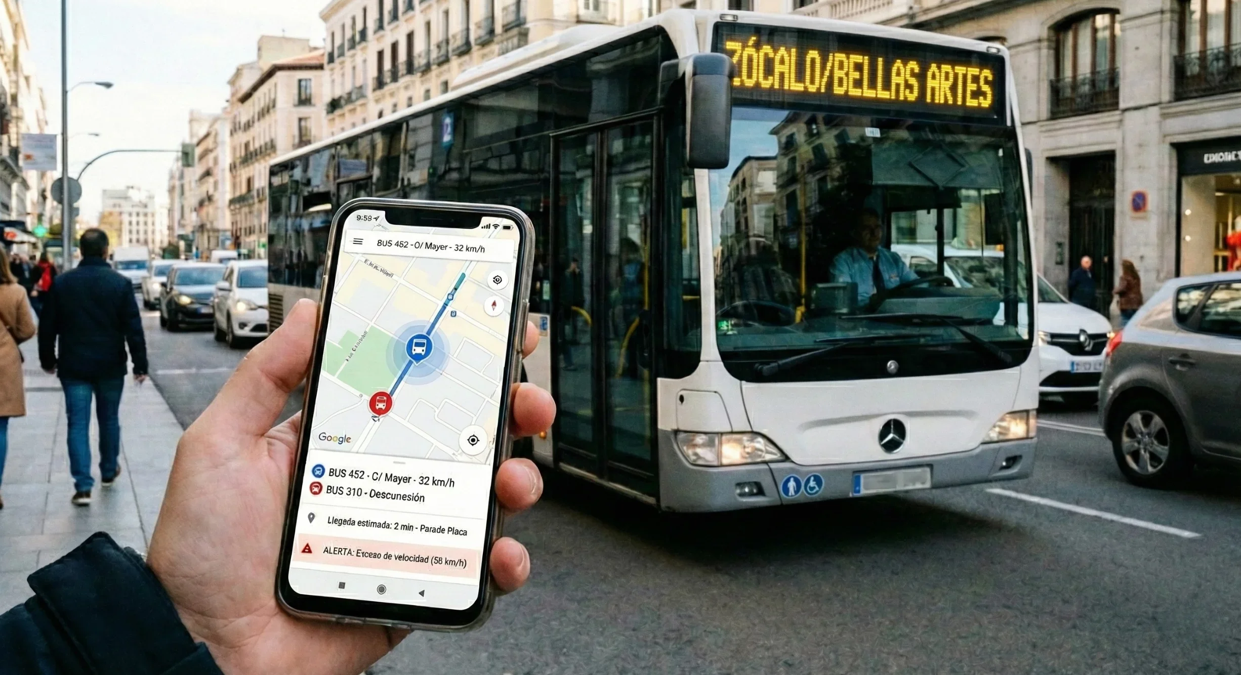 Visualización en mapa: Monitoree el estado, velocidad y dirección de los buses mediante la interfaz de Google Maps